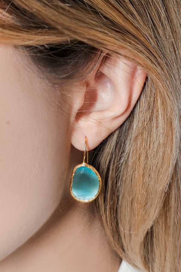 Gold Plated Handmade Earring with Cat’s Eye Gemstone.Dive into a world of enchanting beauty with our Azure Waters Earrings, a mesmerizing masterpiece meticulously handcrafted to perfection. Gleaming in Gold Plating, these exquisite earrings feature bewitching Cat’s Eye gemstones in a captivating shade of Turquoise Blue. Elevate your style with this exquisite accessory, exuding an aura of sophistication and individuality. Embrace the enchanting charm and make a statement that exudes everlasting allure