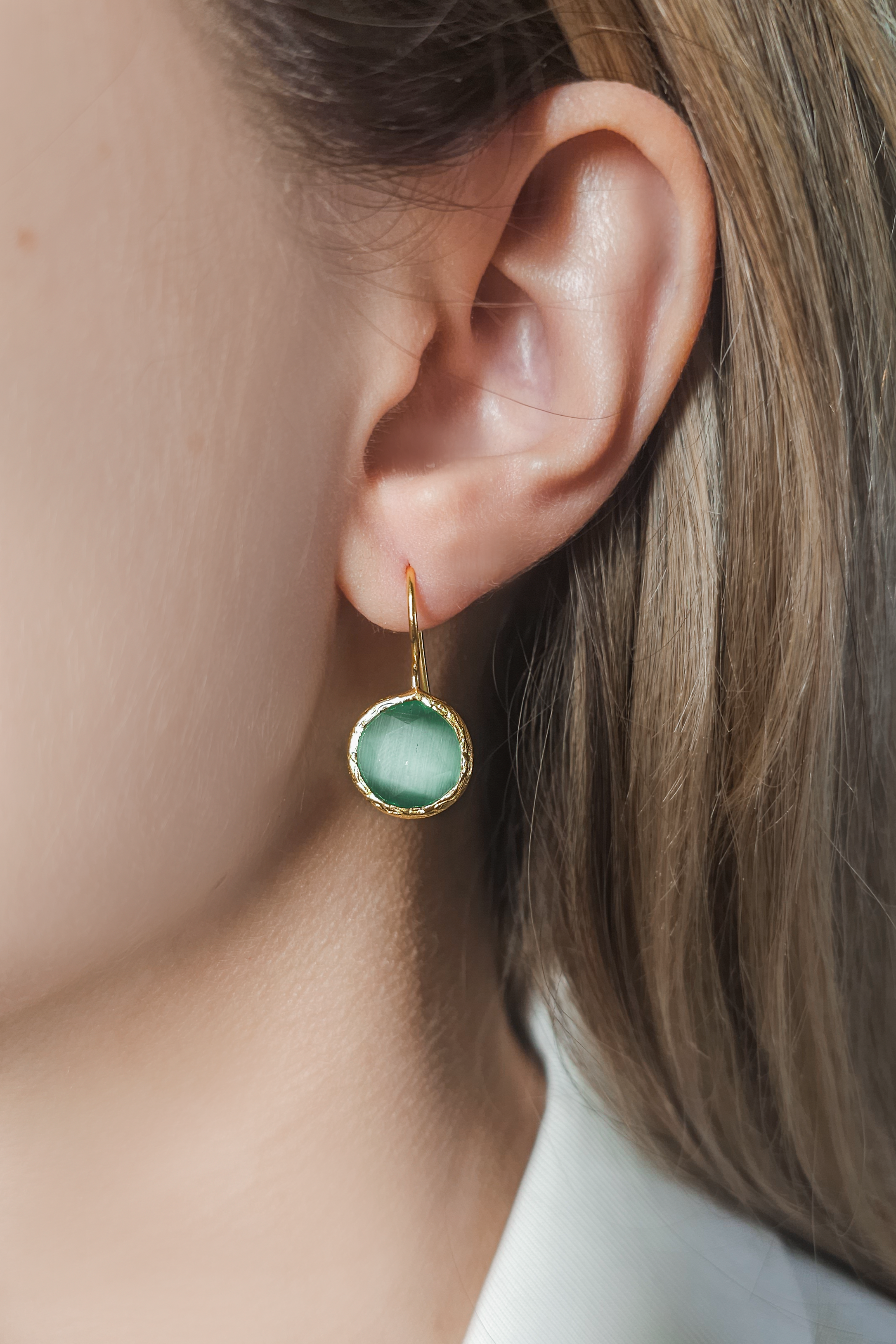 Gold Plated Handmade Earring with Cat’s Eye Gemstone. Radiate with natural elegance wearing our Emerald Serenity Earrings, a mesmerizing masterpiece meticulously handcrafted to perfection. Gleaming in Gold Plating, these exquisite round earrings feature bewitching Cat’s Eye gemstones in a captivating shade of Light Green. Elevate your style with this exquisite accessory, exuding an aura of sophistication and individuality. Embrace the enchanting charm and make a statement that exudes everlasting allure.